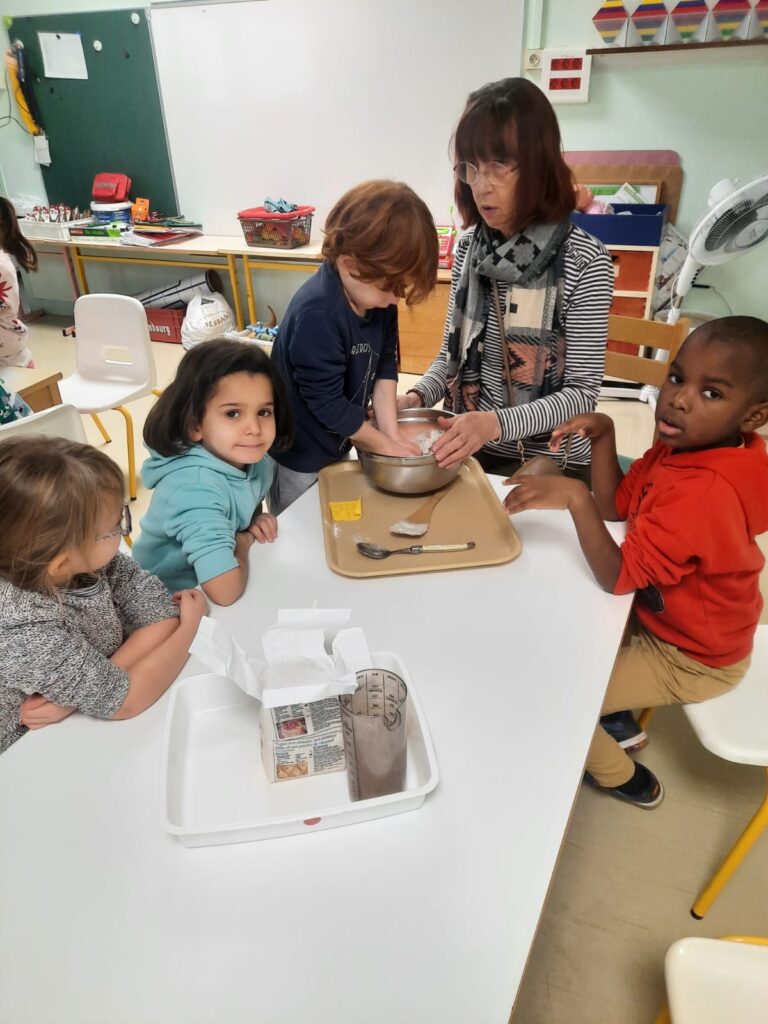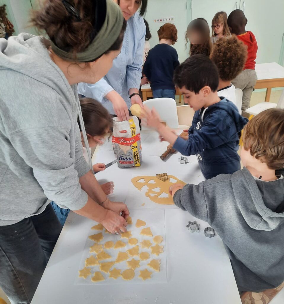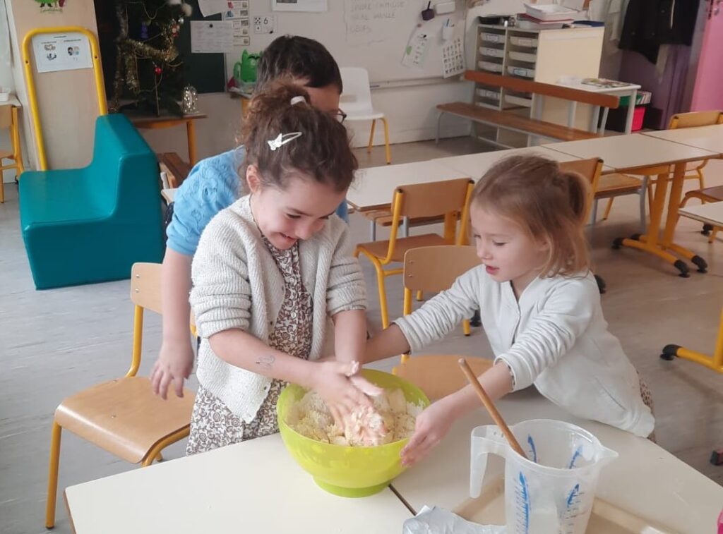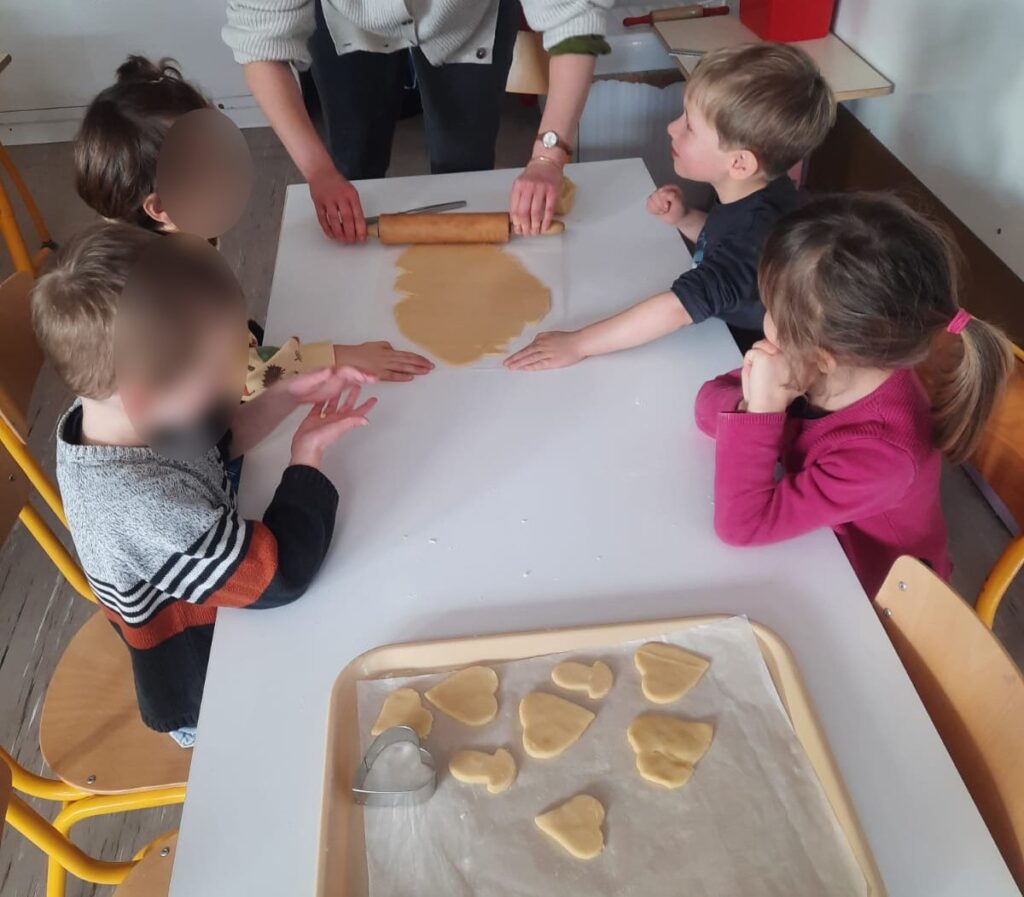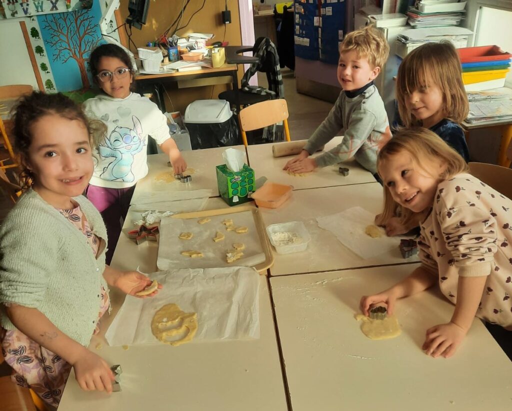 Voici quelques images des Ă©lèves de grande section qui ont mis beaucoup de coeur Ă l’ouvrage dans la confection des sablĂ©s de NoĂ«l :