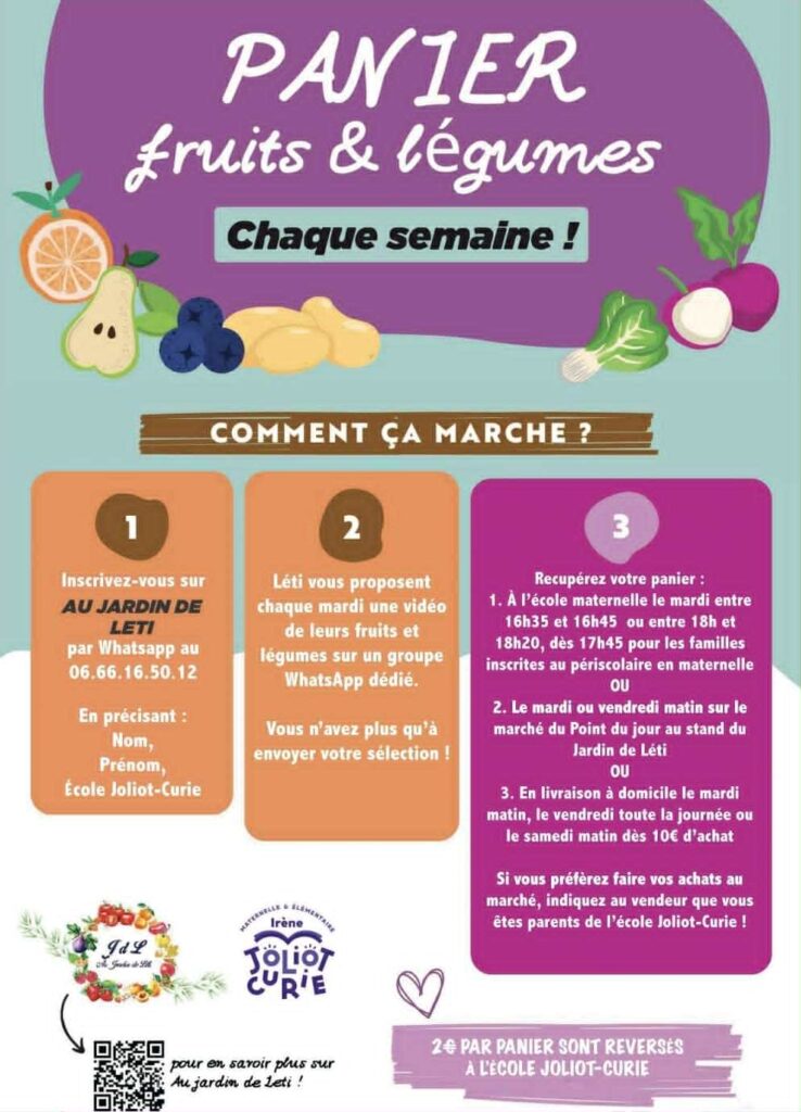 En plus de soutenir une agriculture locale et respectueuse des saisons, ce partenariat permet aussi de faire grandir les projets de l’école : pour chaque panier commandé, 2 € sont reversés à notre établissement !