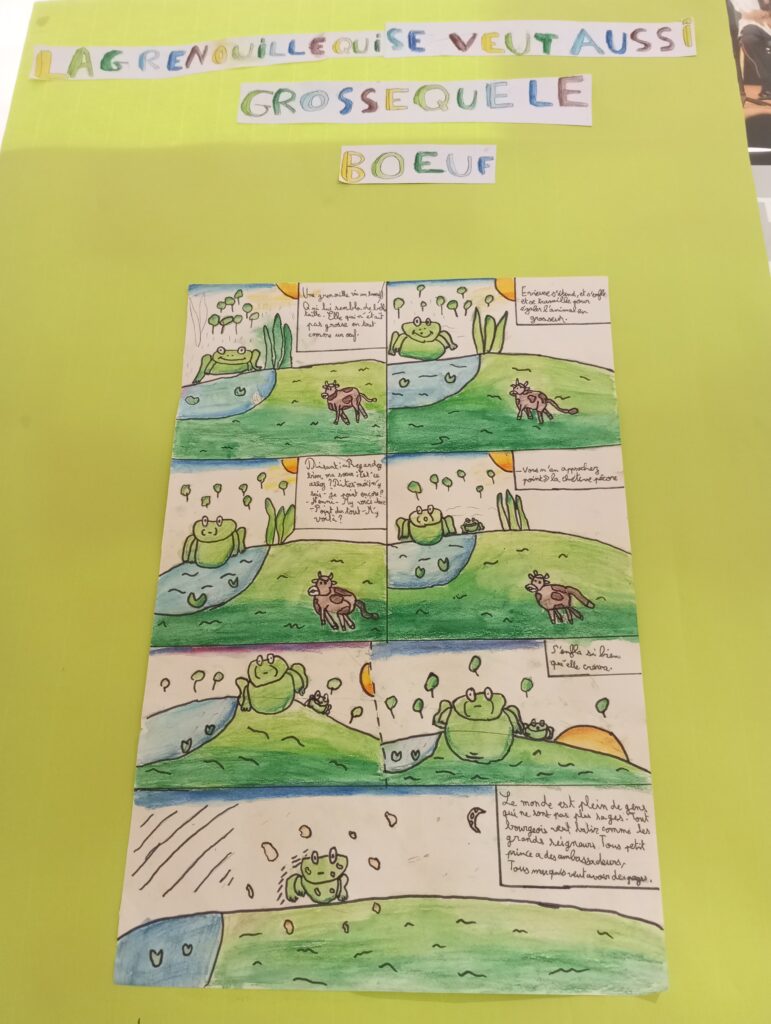 Les fables de la Fontaine sont des histoires que tout le monde connait, des histoires populaires avec une conclusion, une morale. La maîtresse a lu les fables. En groupe par 3 ou 4 on a choisi une fable puis on a illustré la fable en Bande dessinée avec des crayons aquarelle, des feutres, des crayons de couleurs, des feutres acryliques. On a écrit les dialogues, on a fait parler les personnages.