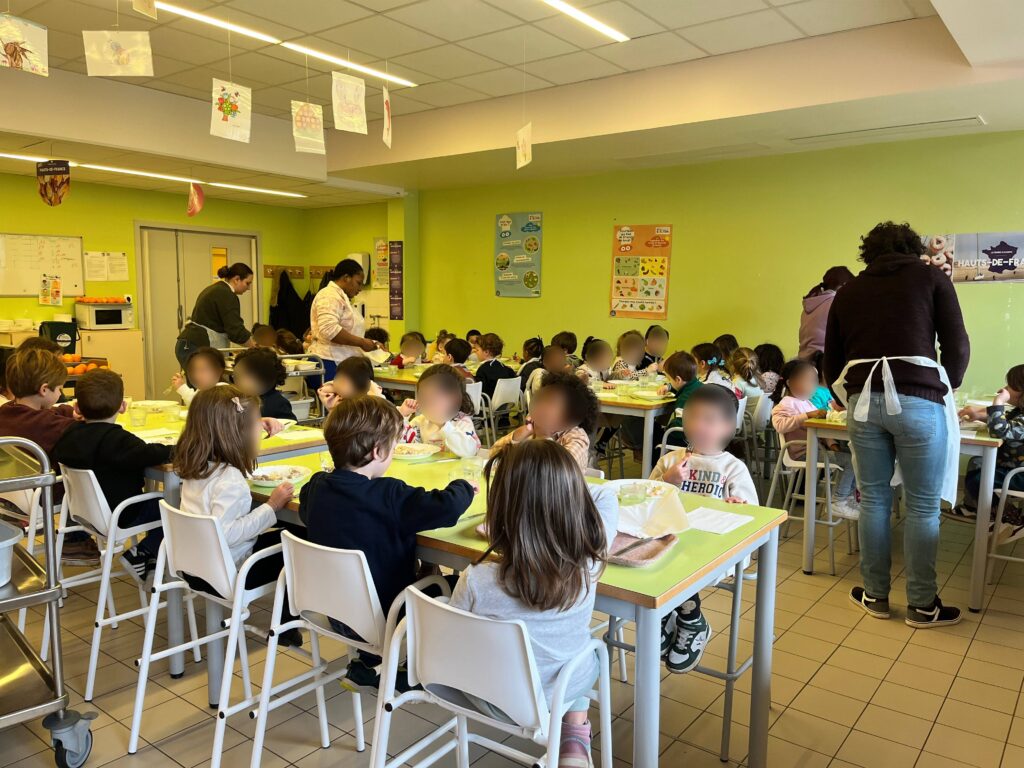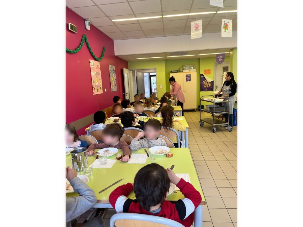 En maternelle, deux services sont organisés : le premier pour les petites et moyennes sections, le second pour les grandes sections, vers 13 h. Les enfants sont servis à table et lèvent la main s’ils souhaitent être resservis.