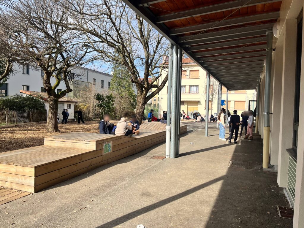 Après le repas, les élèves lèvent le doigt pour demander l’autorisation de sortir. Des animateurs assurent la surveillance et l’encadrement des activités extérieures.