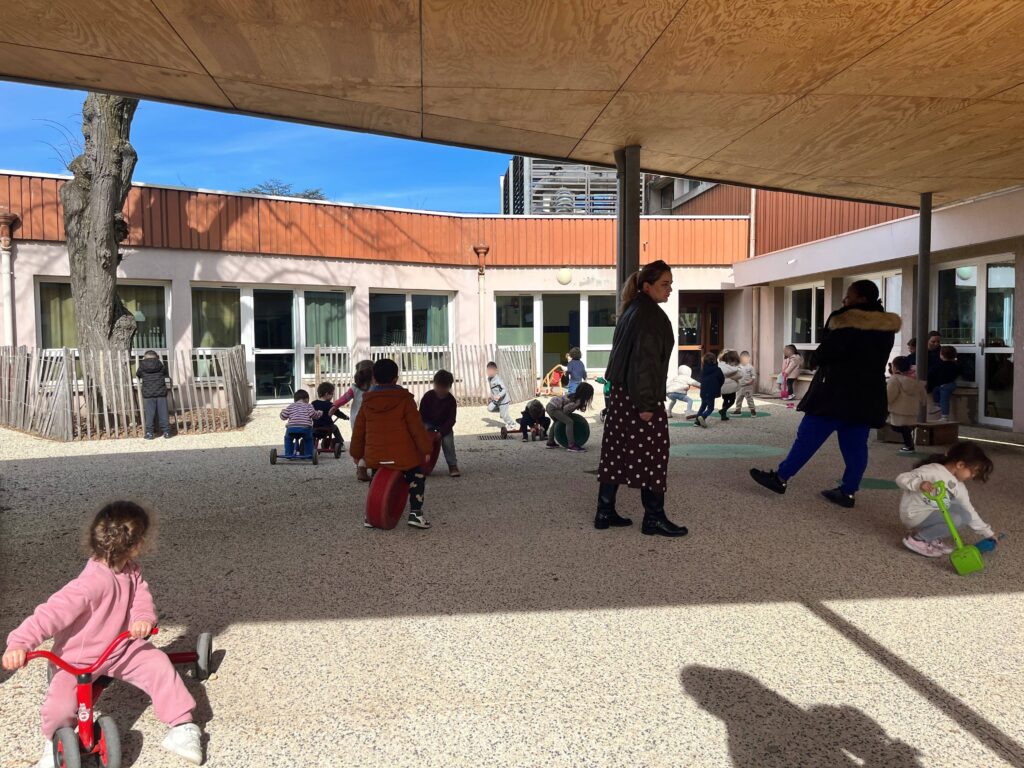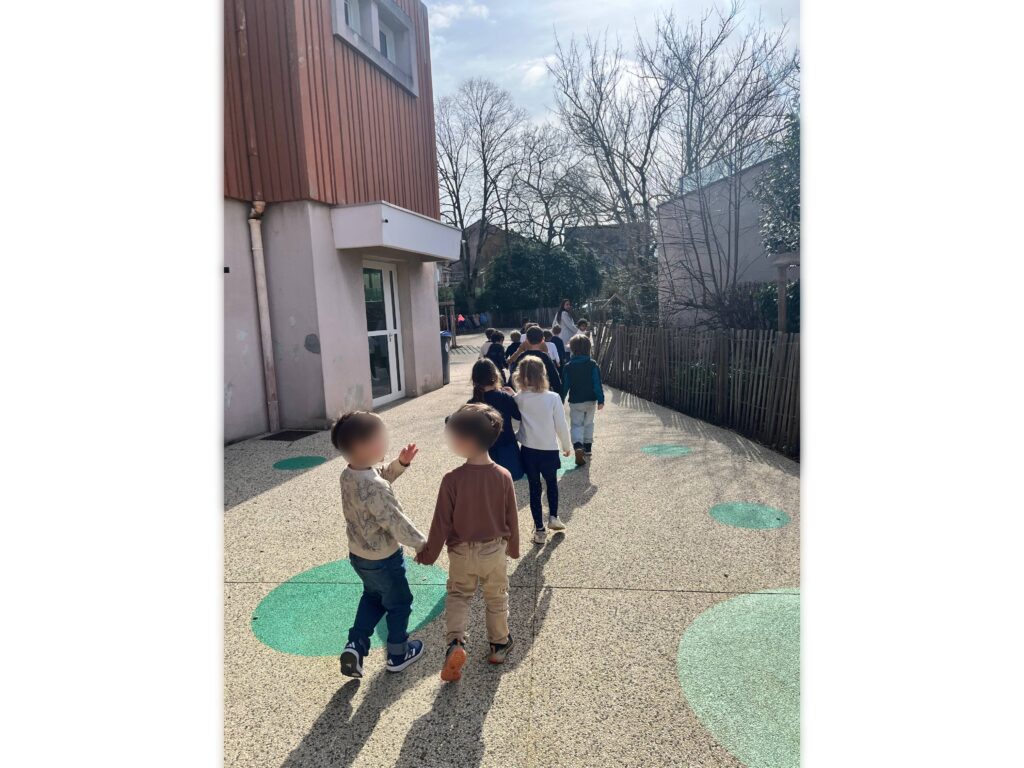 À 13 h, les élèves de grande section se rendent à la cantine, tandis que les petites et moyennes sections rejoignent la cour après leur repas et avant la sieste.