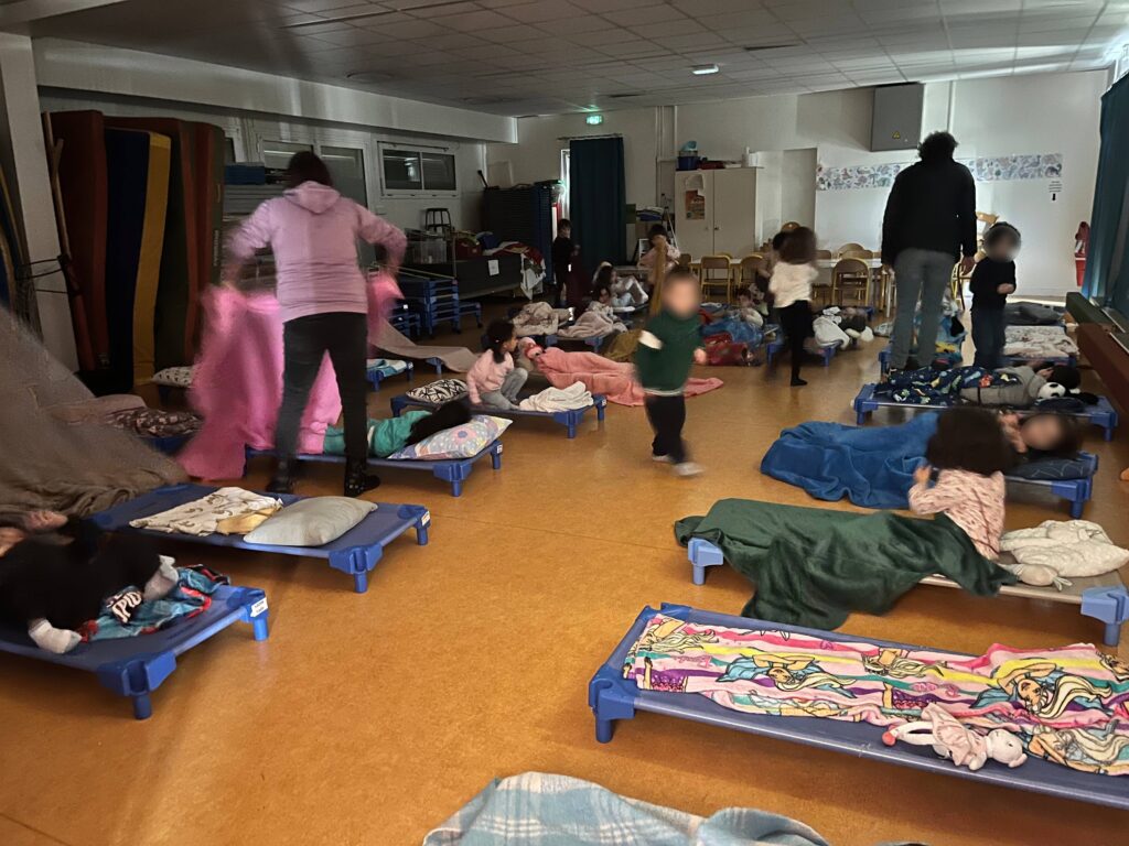 Après le repas, les petites et moyennes sections disposent d’un temps calme dans la salle de sieste dans la salle de motricité pour les moyens. Une histoire, racontée ou diffusée, sert de transition avant l’endormissement.